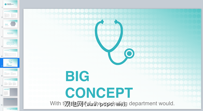 如果您的主题演示需要医疗主题,则此模板是完美的。几张幻灯片上都有听诊器的干净外观。
