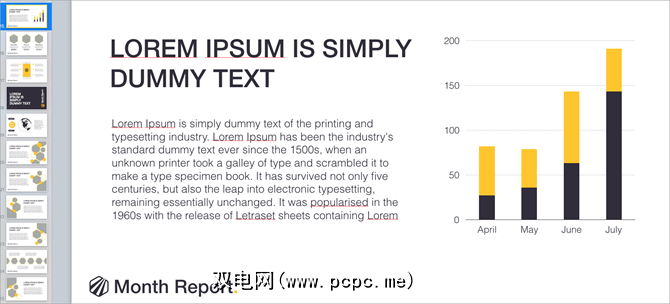如果您需要创建每月演示文稿以报告公司的收入和支出,销售和下载或地理信息,这就是您想要的模板。