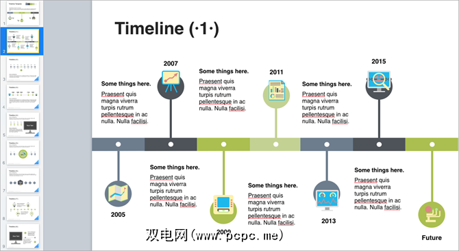 11张幻灯片中的每一张都为您提供了一种独特的方法查看您的时间表。因此,您只能使用一个或几个来显示各种信息。使用一种时间轴样式来显示项目的可交付成果,使用另一种时间轴来显示季度的销售目标,或者使用另一种时间轴来表示成就的大业务视图。幻灯片上有用于显示文字的栏位以及时间轴,非常适合简短地概述观众的观看内容。