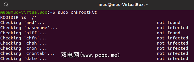 sudo chkrootkitChkrootkit会定期接收更新。定义列表也不断收到新的签名。在撰写本文时,Chkrootkit扫描了70多种rootkit,蠕虫和基于内核的恶意软件类型。因此,尽管Chkrootkit并不是一种防病毒软件,但您仍希望将其保留在附近。