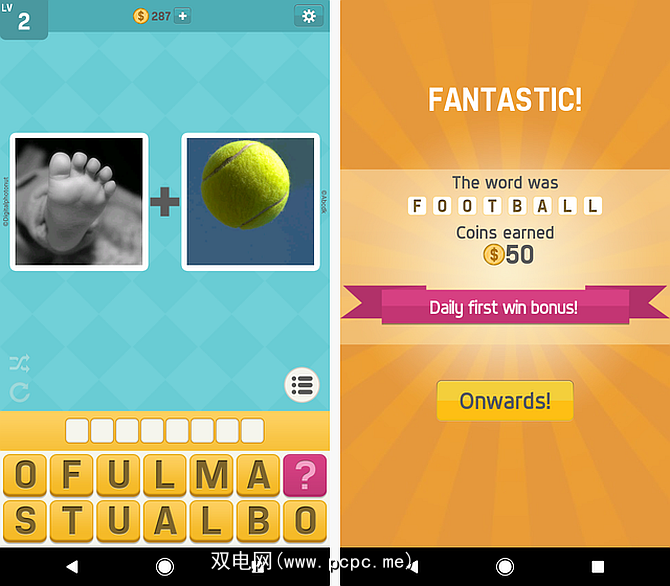 游戏很简单。该应用程序显示两个图片,它们一起代表一个单词。您可以使用下面的字母来阐明您的猜测。