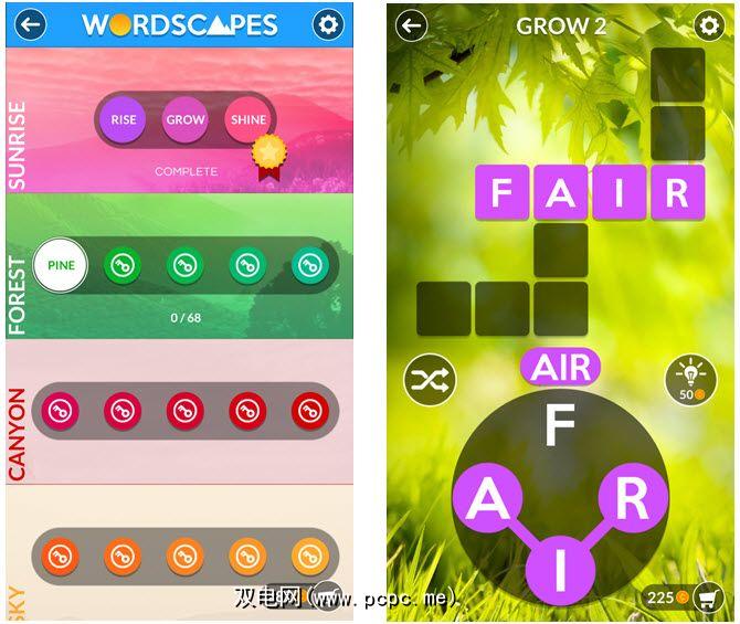 如果您喜欢休闲的文字游戏,那么 Wordscapes 绝对是值得一试的地方。拼图包的主题是从日出到森林再到海洋的美丽影像。游戏还具有令人愉悦的配乐,可增强您的体验。对于休闲和具有挑战性的文字游戏, Wordscapes 很棒。