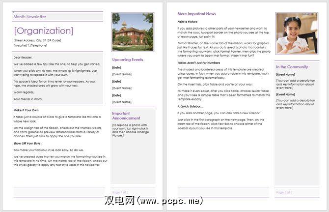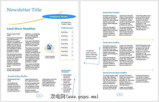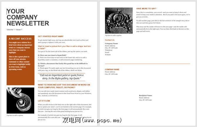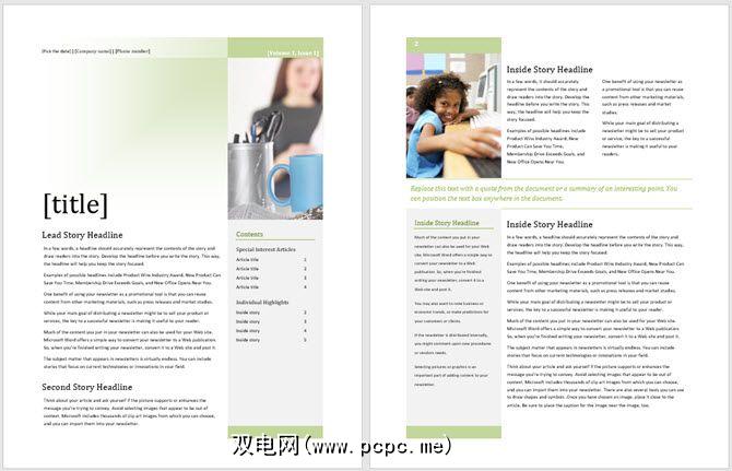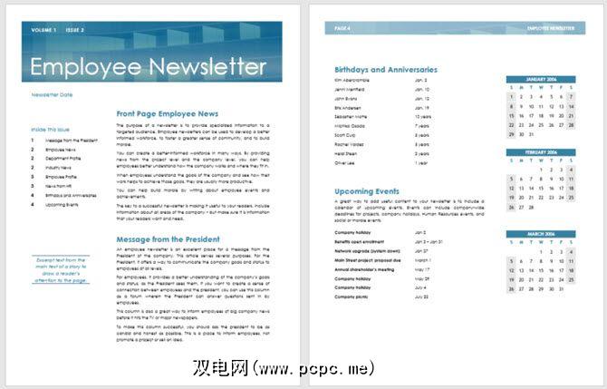 另一种公司新闻通讯选项是Microsoft Office提供的。您可以填写四页信息,这对于每季度或每半年一次的新闻通讯有很大的帮助。借助方便的目录,特殊故事的标注和精美的外观,这是适用于任何类型企业的出色免费新闻通讯模板。