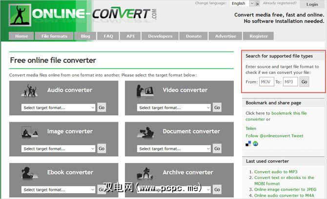 在尝试在Online-Convert.com上进行首次文件转换之前,您可以快速检查支持的文件类型。在右上方的小框中,弹出要转换的文件类型。点击转到,查看该网站是否支持您的需求。然后,当您准备就绪时,可以在主页上的音频,视频,图像,文档,电子书或存档转换器中进行选择。
