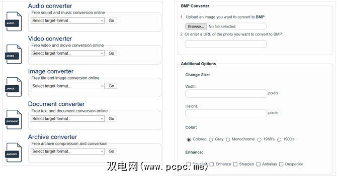 有关免费转换音频,视频,图像,文档和存档文件格式的另一项服务,请查看Online File Converter。只需滚动到所需的转换类型,然后选择目标格式即可。然后,浏览您的文件或输入其URL。