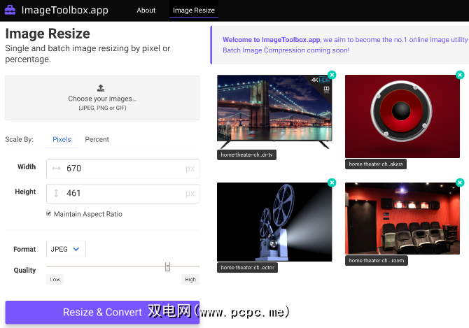 该Web应用程序允许您同时调整一堆图像的大小。您可以根据宽度或高度的特定分辨率或原始图片的百分比来调整它们的大小。