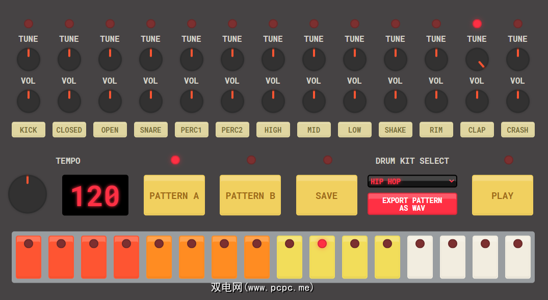 在每个节拍上,您可以选择不同的乐器来演奏,并且可以调节乐器的各种音量,以及它们听起来的深沉或高低。您可以为每个节拍执行此操作,并且可以保存两个单独的模式,但每个模式无法超过 16 个节拍。