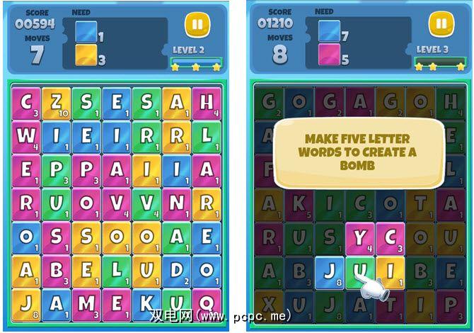 如果您喜欢免费的在线文字游戏,它们融合了其他游戏中的益智元素,那么在您无聊的时候可以轻咬单词叮咬。您从一个色彩斑game的游戏板开始,您只需在字母图块中拖动来创建单词。要获得成功,您必须将彩色图块的数量用于关卡目标。而且移动的次数有限。