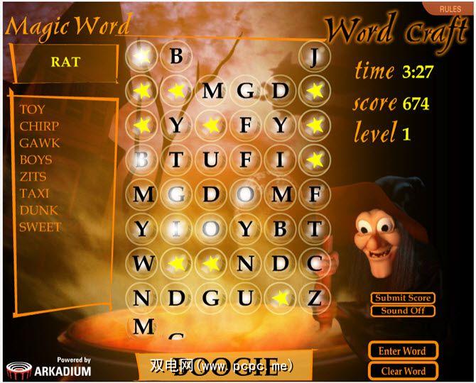 幽灵,地精和女巫全年都会弹出,而不仅仅是在万圣节前夕。 Word Craft 是一款游戏,您可以从显示的字母中创建尽可能多的单词。诀窍是,您必须在时限内和字母到达顶部之前保持发音。冒泡的大锅会不断向您发送信件。
