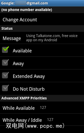 默认情况下,Talkatone会通过将自己添加到Google Talk状态消息中来宣传自己使用它。您可以更改此设置-打开设置屏幕,点击帐户,然后点击Google帐户的名称以自定义状态。