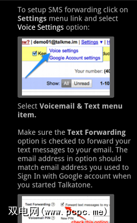 要获得短信支持,请启用Google语音中的“ 文本转发"功能,将文本消息转发到您的电子邮件。启用后,您就可以从Talkatone发送和接收SMS消息。