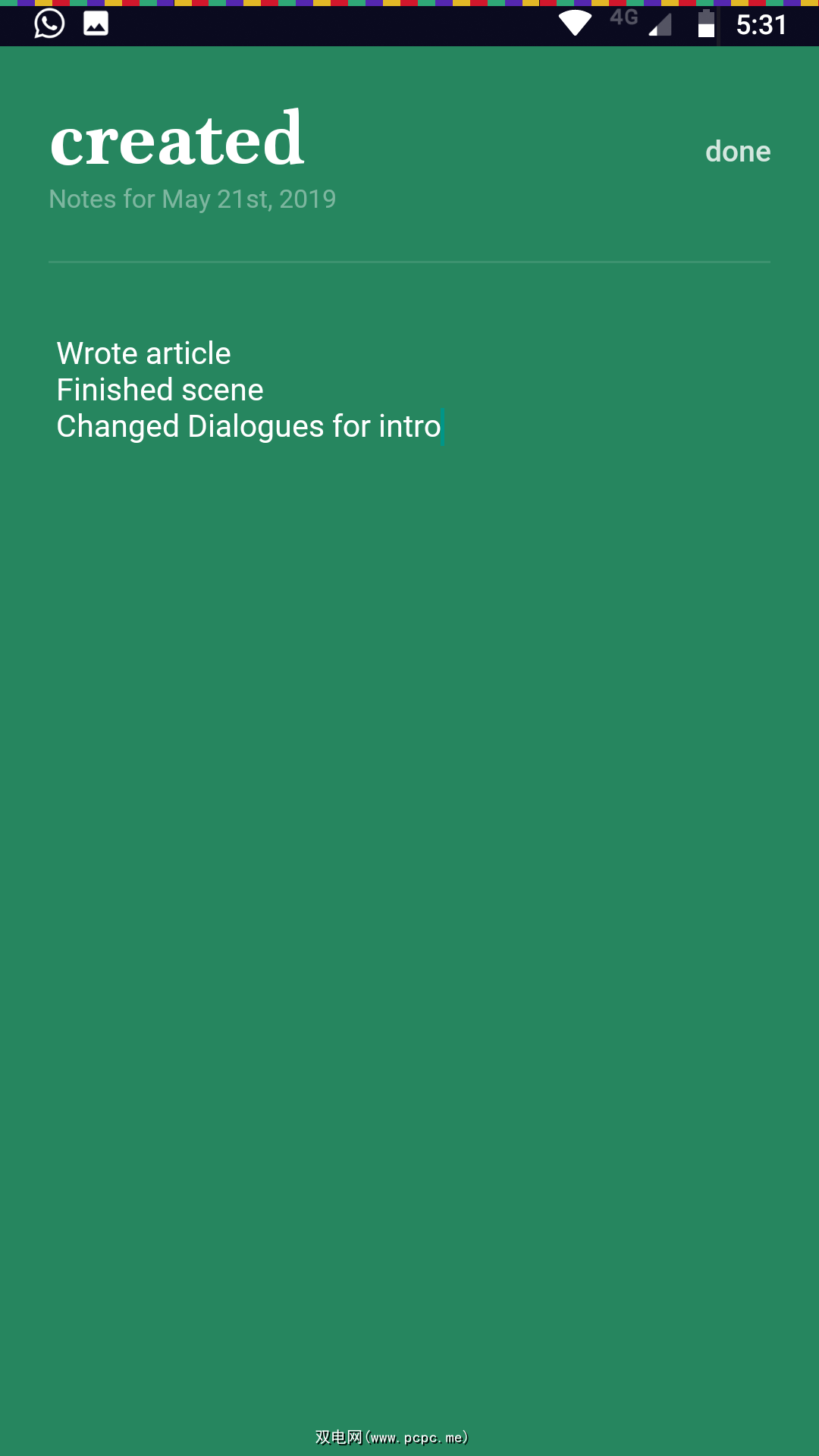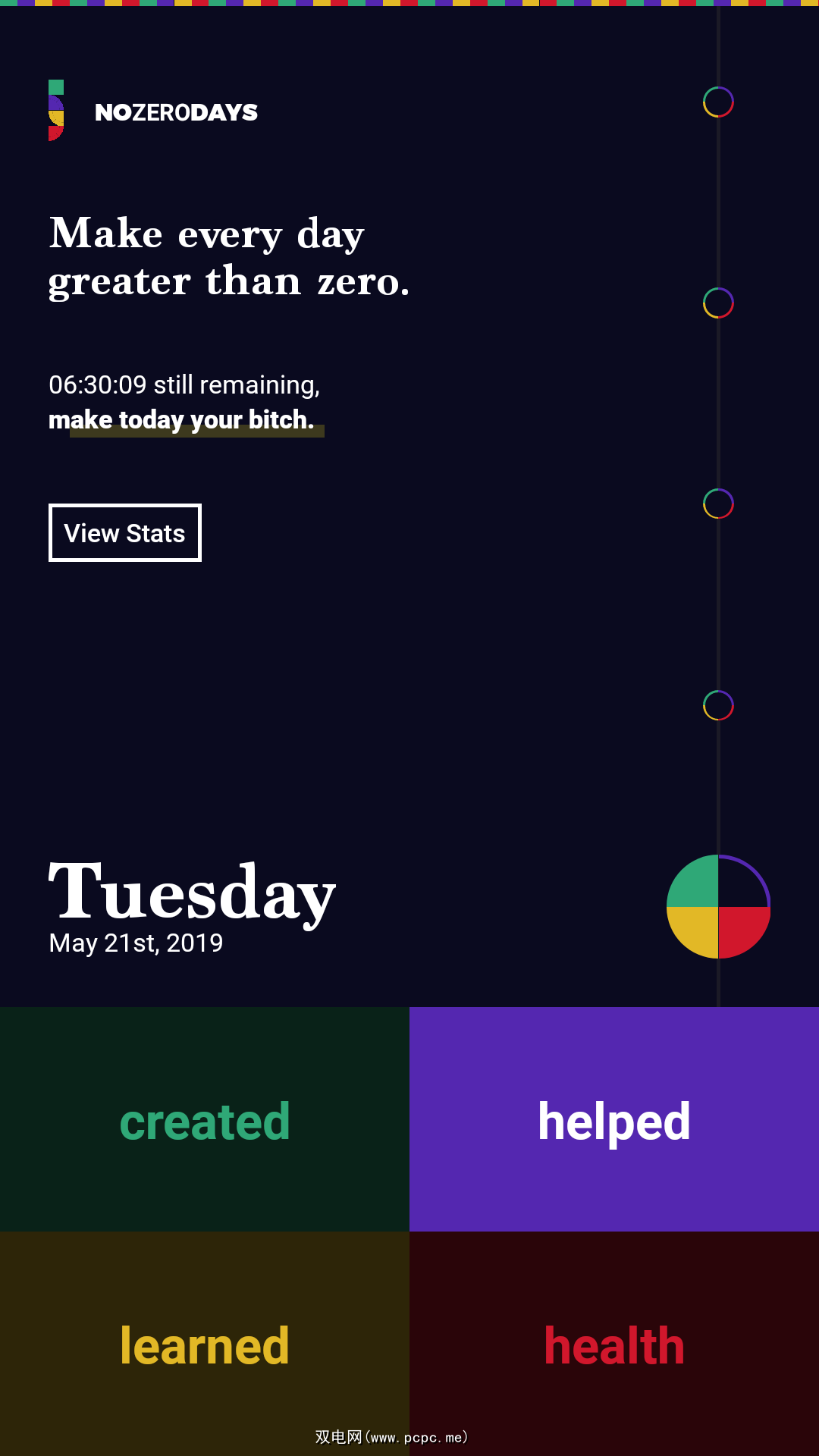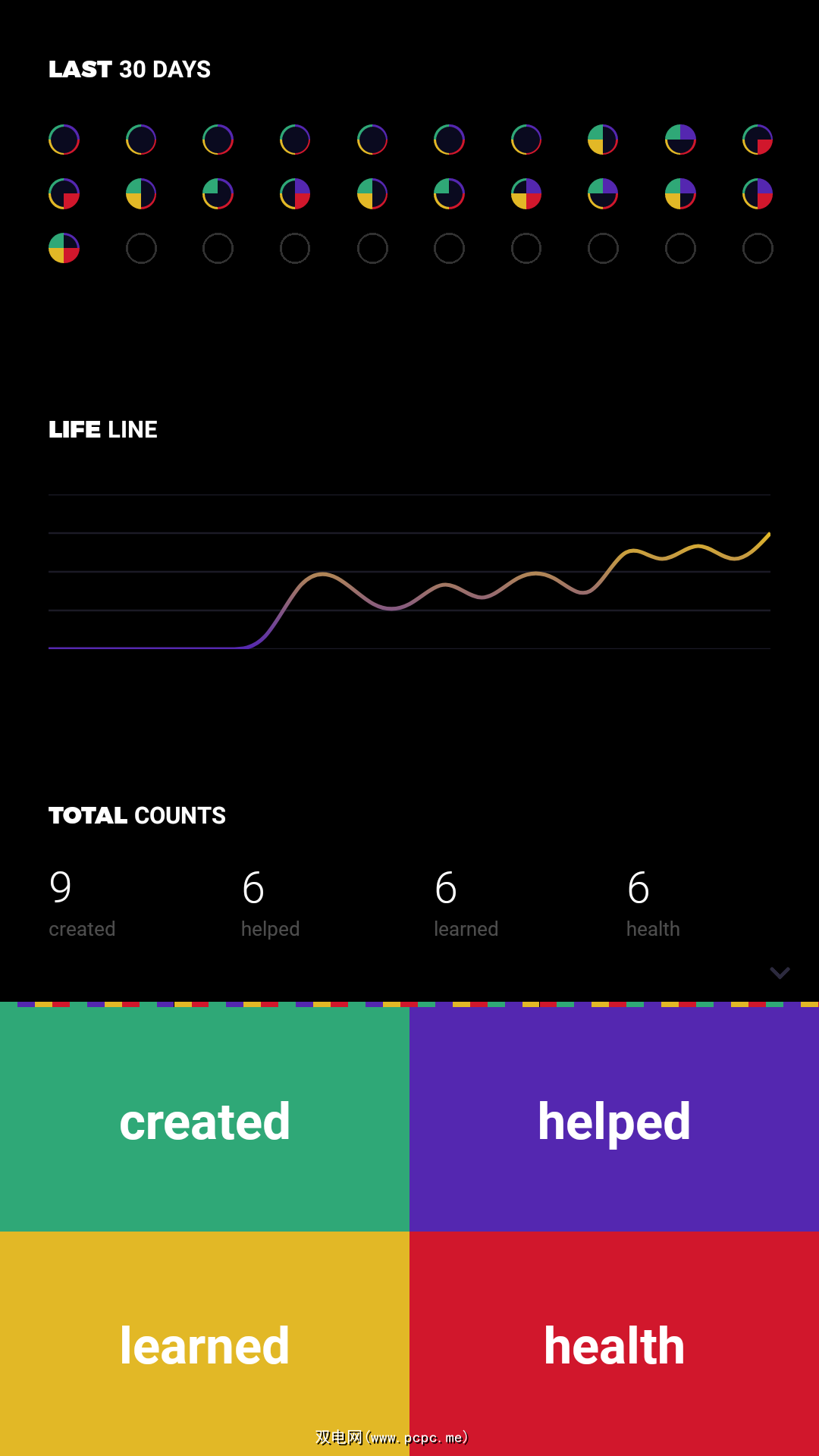 它将您的一天分为四个步骤:创建,帮助,学习和健康。每天,当您朝着这四个类别中的任何一个进行最小的操作时,请点击该按钮。您可以长按按钮以写下关于您所做的事情的注释,甚至可以完全更改类别。首先,您可以回溯一周以添加在安装应用程序之前几天内所获得的成就。