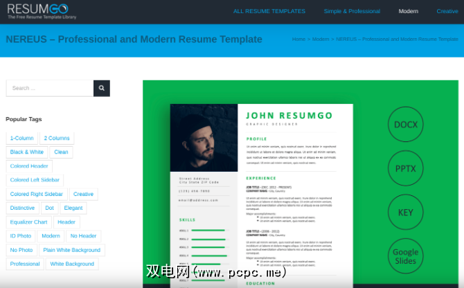 该网站还使您可以轻松浏览带有简单类别和过滤器的模板库。类别将模板分为“简单和专业",“现代"和“创意"。过滤器包括1列或2列,ID照片或无照片,黑白或彩色等选项。