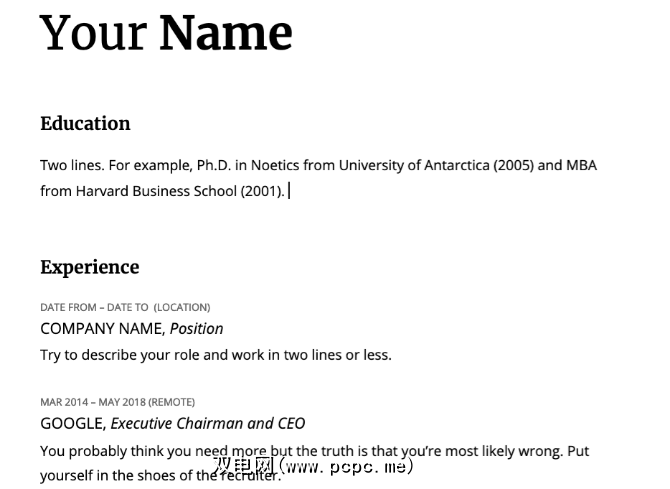除了以前的工作经验之外,这里还简要介绍了您的学历,然后提供了联系方式。严重简单性简历仅此而已。它具有大字体,并且看上去宽敞整洁,这使它在招聘人员中脱颖而出,这是因为它具有通常的简历,而且信息过载。