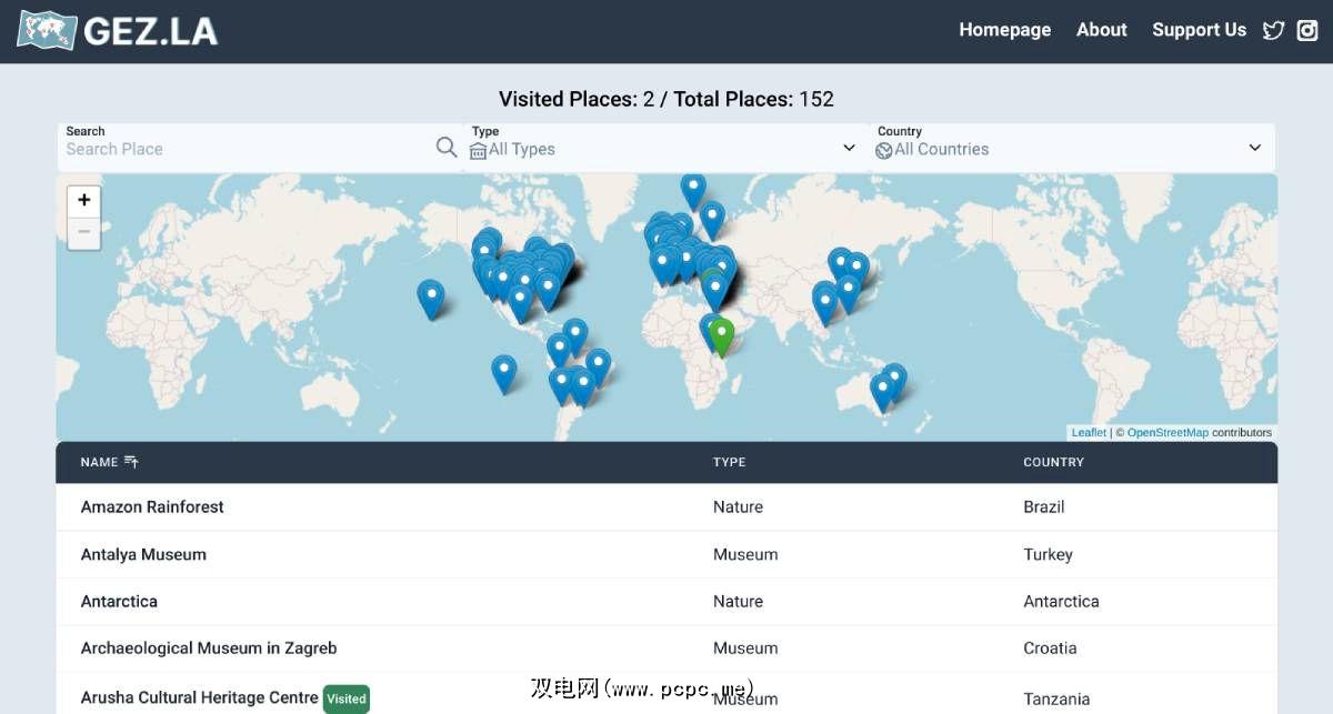 Virtouroso 的界面有五个下拉栏可供选择,分别是博物馆、历史遗迹、自然与科学、陆地动物视频和海洋动物视频。Gez.La 拥有一个目录,其中列出了 152 个有趣的虚拟旅行地点,您可以按类型(水族馆、历史、博物馆、自然、主题公园、动物园)和国家/地区进行过滤。您还可以浏览世界地图上的图钉。