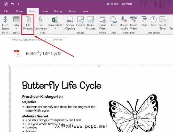 要使PDF进入OneNote,我使用了文件打印输出选项将PDF添加到我的笔记本页面之一: