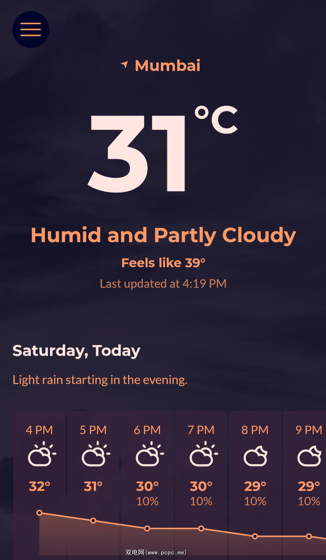 Breeze从Dark Sky获取数据,因此您可以放心您可以依靠的定期更新。主屏幕为您提供今天的温度,天空条件和真实的天气预报。您还可以在其下获取每小时的天气预报,在其中可以查看下雨的机会。