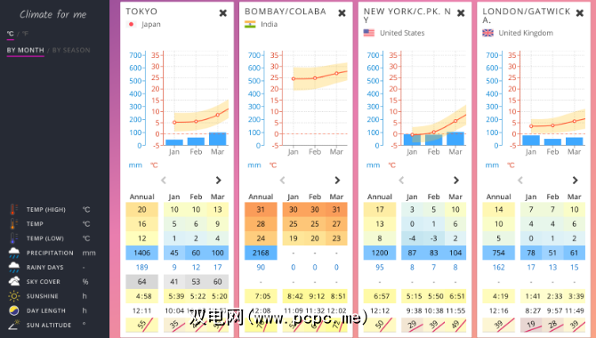 乍一看,该网络应用似乎有些吓人,但并不像看起来那么难。搜索多个城市以将其并排添加。向下滚动至表格以查看各种天气指标的年度值,以及逐月的变化。
