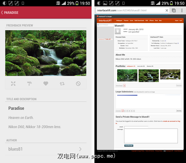 这是应用程序的重要方面:每个图像都完全归功于其原始上传者(希望该上传者也是,它的原始创建者),您可以直接从Freshbacks中轻松访问其InterfaceLIFT配置文件。很高兴看到墙纸应用程序在分配原始作品时会格外小心-许多墙纸网站可悲的是忽略了这些。