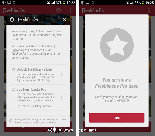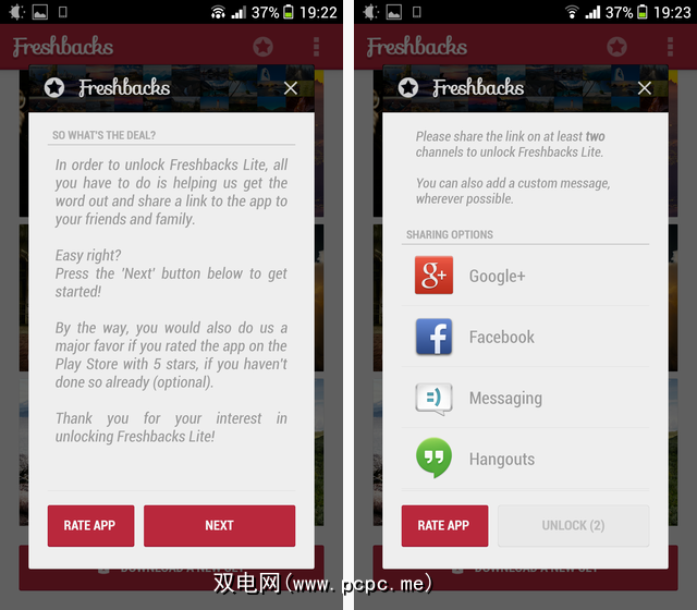 Freshbacks Lite为您提供了Pro可获得的一些功能(但不是全部),以换取通过以下两个社交渠道共享该应用程序Android的本机共享功能。后一部分-本机共享功能-很重要。 Freshbacks不会不要求直接访问您的Twitter帐户或任何其他社交媒体帐户,并且不会代表您发布任何内容。它只是看着您两次使用Android的共享功能,仅此而已。是的,您可以通过在电子邮件中“共享"给自己(通过与应用程序的链接来欺骗自己)来欺骗,但是Freshbacks确实足以与您的朋友共享-这种开明且非侵入性的社交共享方法应该