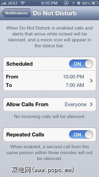 再次,打开设置应用,然后点击通知,然后点击请勿打扰按钮。从那里您可以安排时间使通知静音。请注意,您还可以设置为不让来自选定联系人(例如家庭成员)的电话静音。