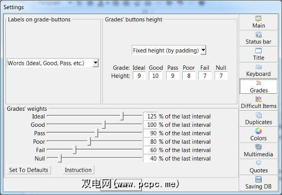 但不是所有设置是肤浅的。例如,在“成绩"菜单下,您可以更改问题的评分如何影响其时间间隔,可以更改评分的方式,也可以更改评分的权重。在“困难项目"下可以找到更重要的调整,可让您决定何时FullRecall将问题标记为特别难记,而“重复项"则可用于自动摆脱相同的问题。