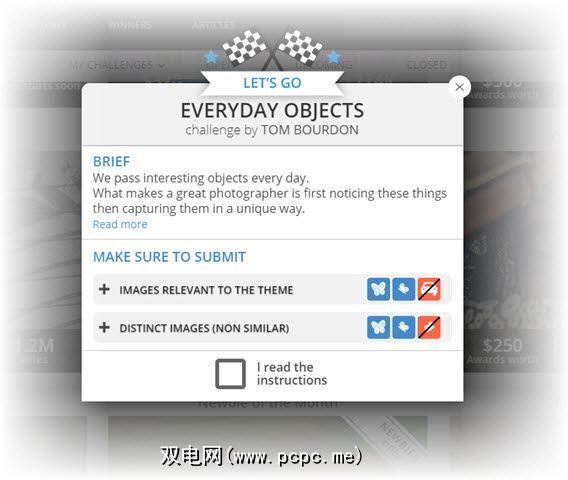 该挑战将帮助您了解事物的运作方式。您也可以与此同时参加任何其他挑战。但是,请访问Winners画廊以获取一些启发。也许它会激发您足够的精力来消除您的DSLR,寻找业余时间并加入这个全球社区。 p>