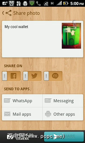 如您所见,您可以轻松地通过Twitter和Facebook共享照片,并且您已经安装了多个其他应用程序,例如WhatsApp(和其他消息传递应用程序),电子邮件应用程序,Dropbox,蓝牙等。您还可以为每张照片添加一个简短标题。