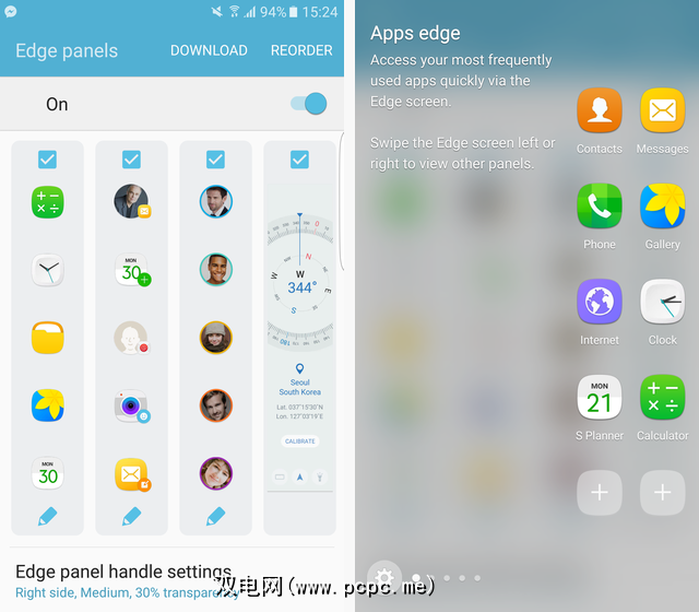 这些是用于您的 edge 部分的应用Galaxy S7 Edge。从屏幕侧面滑动即可访问多种工具,并且这次可高度自定义。您可以选择从屏幕的哪一侧进行滑动,屏幕的哪一部分以及该滑动区域的指示器的透明性。