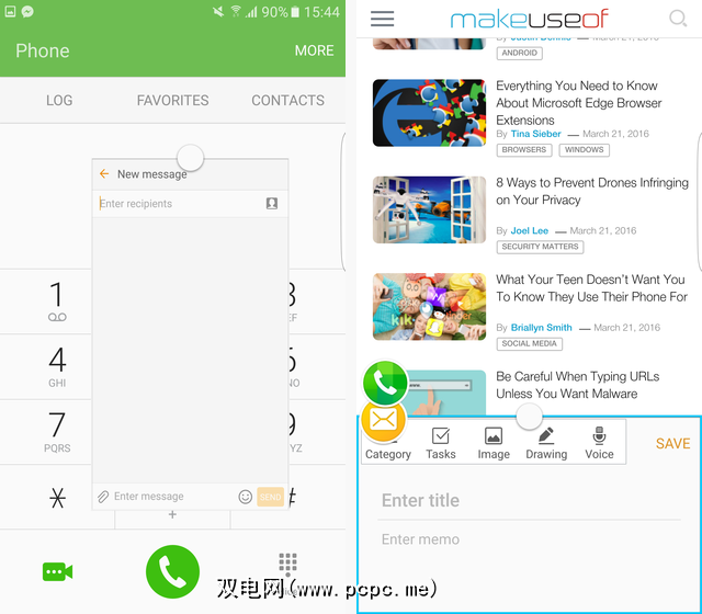 现在,如果您希望将应用程序作为浮动窗口打开,则可以可以从左上角下拉您的应用。然后,该点使您可以将其拖动到屏幕上,甚至可以将其最小化为一个小的浮动图标(如上图所示,与Phone and Messaging应用程序一起显示)。