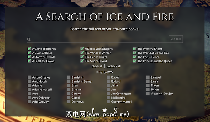 正如标题所说,《冰与火的搜索》索引了马丁的所有书籍,并允许您搜索其文本。我想说的是,这个网站是关于书籍的,但实际上不是。