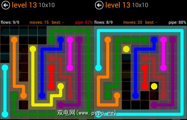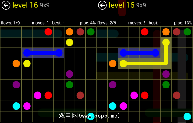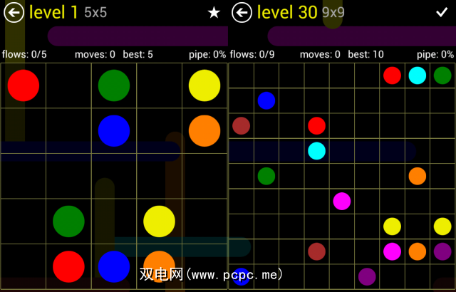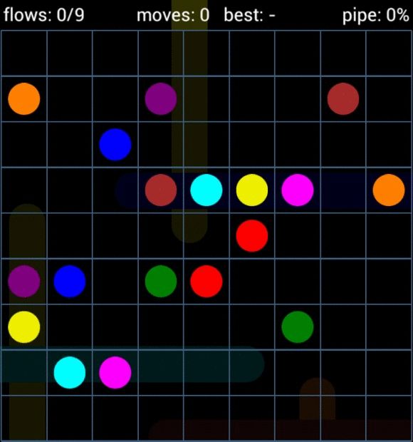 简而言之,您面临的挑战是连接网格上的所有点,而又不留任何空白。您只能连接相同颜色的点以在它们之间创建流。总流量等于以完美的方式完成关卡所需的最小移动量。随着游戏通过关卡,网格变得更大,并且您面临着越来越多的点,这使得解决难题变得越来越困难。