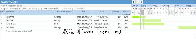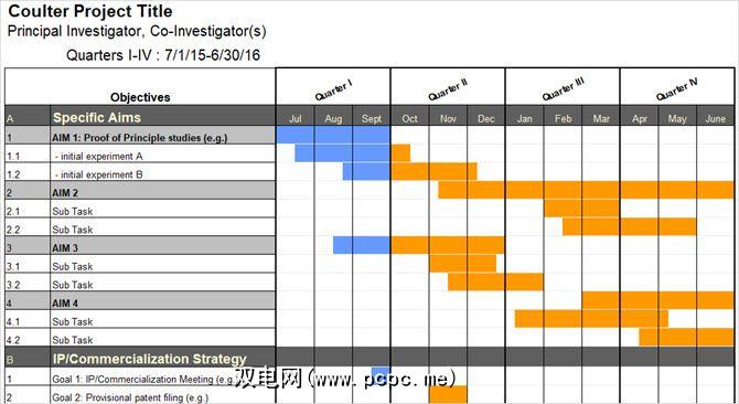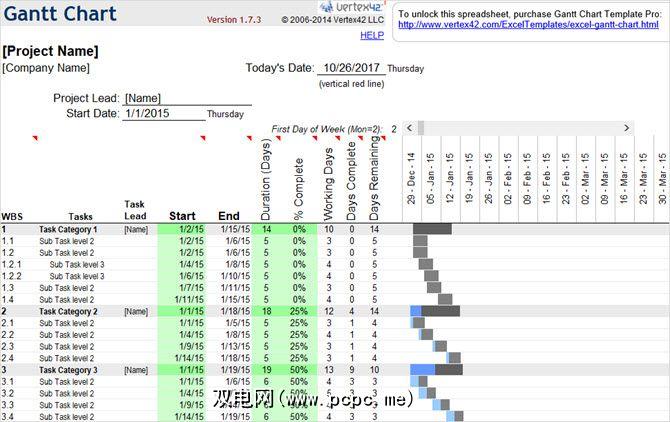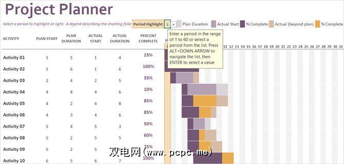 更详细的甘特图模板提供了日期和持续时间。但是,如果您只是想简单了解项目的计划时间和完成时间,则可以尝试使用此Excel模板。