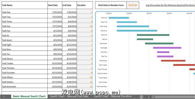 如果您不确定要手动输入哪些条目来调整甘特图,请从TeamGantt中检查此选项。该工作簿具有三个选项卡,其中包括完整的手册表,手册结束日期表和手册工期图。