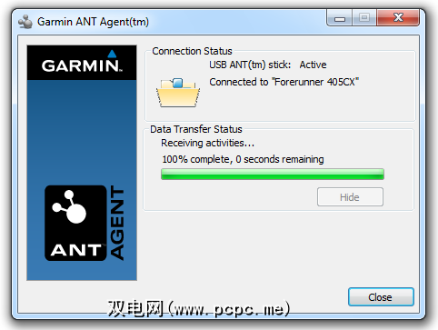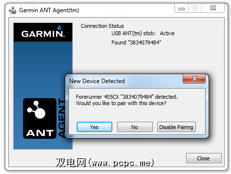 一旦完成培训课程,就该将数据上传到Web上了,看看你做得如何。使用随附的USB ANT Stick完成此操作:设置Garmin的软件,插入该Stick,然后它识别出手表在附近并要求与它配对: