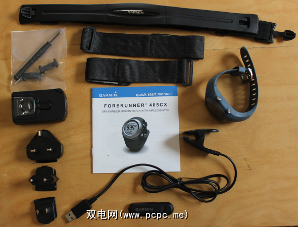 405CX随附了令人印象深刻的附件包。在此图像的中间列中,您可以看到大号塑料HRM(心率监视器)传感器带,两个备用手表带,用户手册,充电座和Garmin ANT +无线通信器(看起来像磁盘的位) -底部的键上)。在左侧,您可以看到附带的工具以及带有三个可互换壁式插头的国际充电器。最后但并非最不重要的一点是,在右边是CX450本身–一个相当笨重的设备。