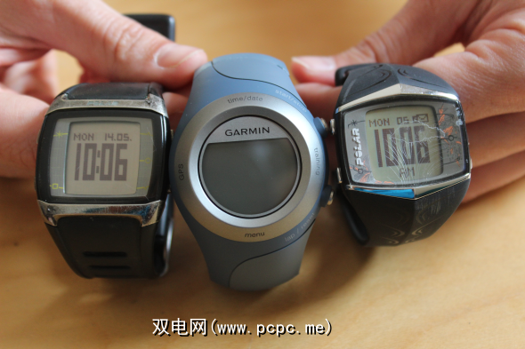 Garmin Forerunner 405CX甚至是笨重的手表。大型FT60。在上方,您可以看到男士的FT60(左),405CX,以及一副磨损严重的女士的FT60。 FT60不包含内置GPS,这说明了为什么它比405CX小得多。