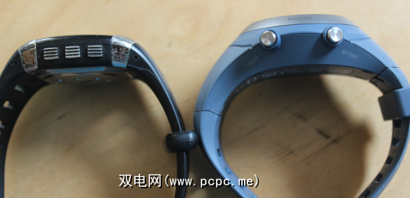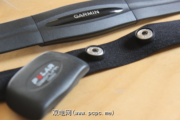 在下面,您可以看到标准的Polar WearLink皮带(正面)与405CX皮带形成对比。 Polar表带非常细且灵活,其HRM传感器部件可上下夹。使用Garmin,传感器直接内置于表带中,该表带主要由塑料制成,而且重量更大。