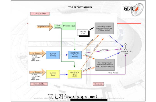 为处理庞大的数据量,GCHQ创建了一个专用的数据存储设施,称为The黑洞。根据2012年爱德华·斯诺登(Edward Snowden)泄露的一份报告,其中包含超过1万亿条记录。从那时起,考虑到当时收集到的大量数据,GCHQ的容量肯定呈指数增长,而且GCHQ预计最终每天将收集1000亿条记录。