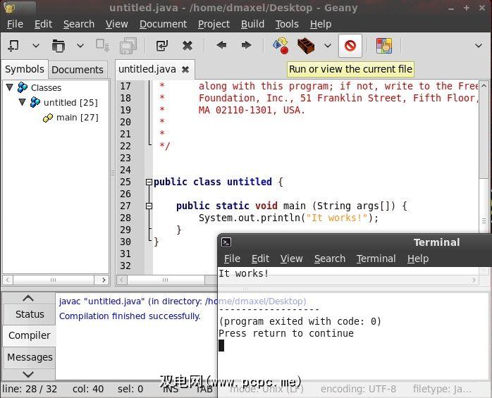 编译和运行代码非常容易。只需单击一个按钮即可进行编译,完成后,单击另一个按钮即可运行。按下run键时会发生什么情况取决于您所编程的内容,但例如,如果您使用Java编写了一个非常基本的程序并运行该程序,则将使用您的首选终端显示输出。程序在终端中运行完毕后,您只需按一次Enter即可退出。