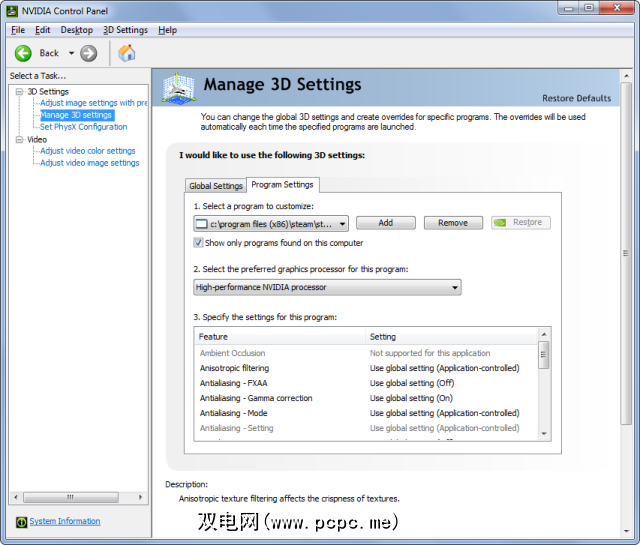 此工具可让您调整默认图像设置。您的计算机使用-例如,您可以在快速的硬件上选择高质量的图像,或者在速度较慢的硬件上选择质量较低的图像。您可以调整全局和每个程序的图形硬件设置-例如,您可以在不支持该功能的特定旧游戏上强制启用抗锯齿功能,以减少锯齿边缘并改善游戏外观。 NVIDIA控制面板还定期检查图形驱动程序更新。