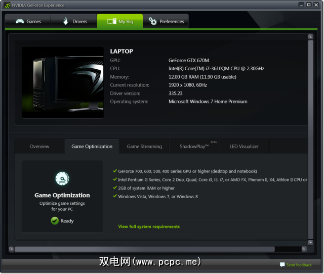 此选项卡还显示了其他可用选项功能,并告诉您系统是否符合最低规格。例如,可从PC到NVIDIA Shield的游戏流,用于游戏视频捕获的ShadowPlay以及用于控制带有集成灯的高端卡上的LED设置的LED Visualizer。