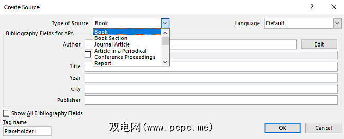 在窗口中屏幕上弹出的窗口,请从下拉菜单中选择来源类型(例如,图书,期刊,网站,电影等)。您需要填写的字段将根据您选择的来源类型而变化。