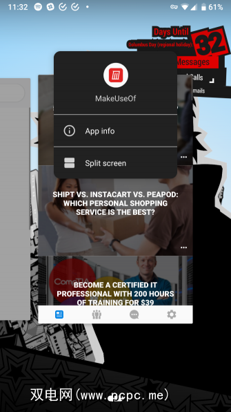 - 点击应用的图标,然后选择分屏以将其发送到顶部。然后选择另一个应用程序放在屏幕底部。将中间的手柄拖到顶部或底部以结束分割屏幕。