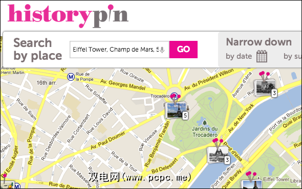 历史记录图钉使贡献者可以将他们的地标照片地理定位到Google地图。在网站上时,您可以搜索埃菲尔铁塔之类的位置。 “到达"目的地后,您会看到一组聚焦于金属奇观的照片,其中包括1855年的图像和描绘2008年除夕的场景。这些只是发现的许多图片中的一些样本