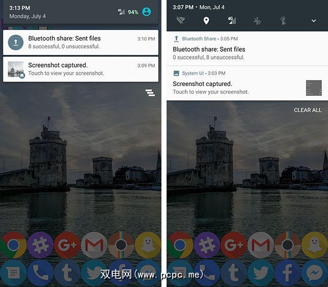 上面,您可以看到状态栏和通知从Android棉花糖(左)到牛轧糖(右)的区别。 )。当然,您是否喜欢它是主观的,但是我发现它看起来更现代并且符合Google的材料设计指南。加上它,您可以更快地访问某些“快速设置"。