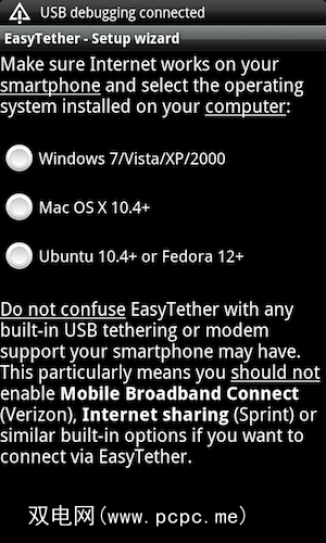 EasyTether在Windows(Windows 7 / XP / Vista),Mac(10.4+包括10.7)和Linux(Ubuntu 10.4 + / Fedora 13+)。只需访问EasyTether驱动程序站点,即可找到适合您计算机的软件。 EasyTether建议您在安装驱动程序时不要将手机插入计算机。
