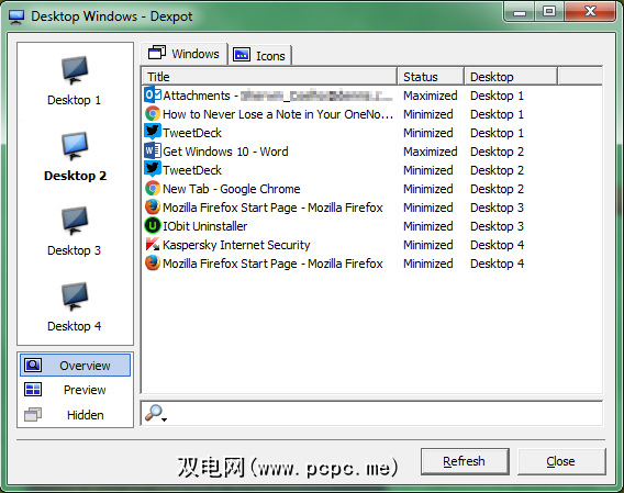 在PC上打开Dexpot以获取更多选项。默认情况下,您有四个虚拟桌面,但是可以在程序的设置中将其增加到12个。点击程序后,选择桌面预览模式。在这里,您会在屏幕右下角看到所有虚拟桌面,它们都是磁贴。您可以在这种模式下将程序从一个桌面拖放到另一桌面。