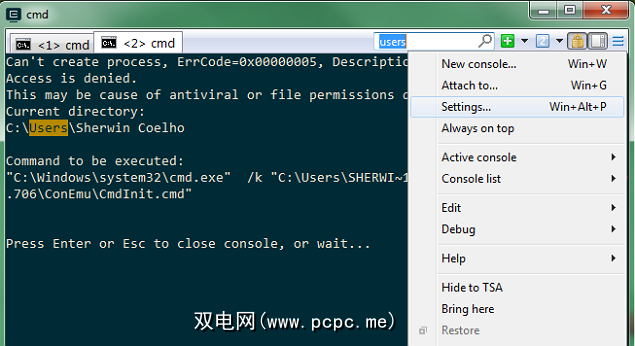 如果要在Windows 7或8上使用类似的命令提示符功能,请尝试 ConEmu (控制台仿真器的缩写)。除了让您从其他程序中复制和粘贴文本外,您还可以打开多个标签(类似于Chrome),它可以让您搜索在命令中键入的值。