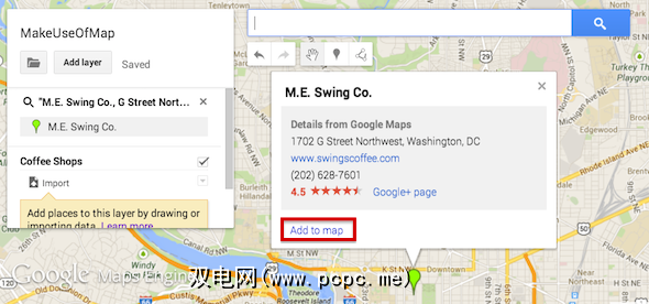 重命名后地图和无标题图层,搜索位置,然后可以将位置添加到图层中。找到要添加的位置后,您可以从Google地图查看其他详细信息(确切的位置,电话号码,网站等),然后可以通过单击“添加到地图"链接将其添加到图层中。
